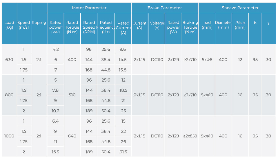 Rated Load: 630 - 1000 kgSpeed: 1.0 - 2.0 m/s